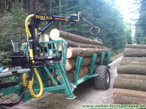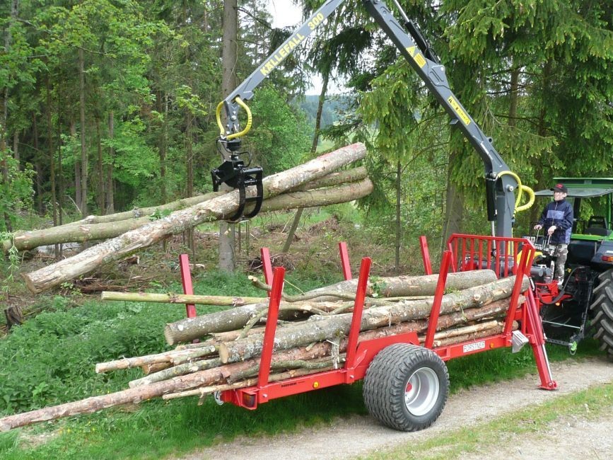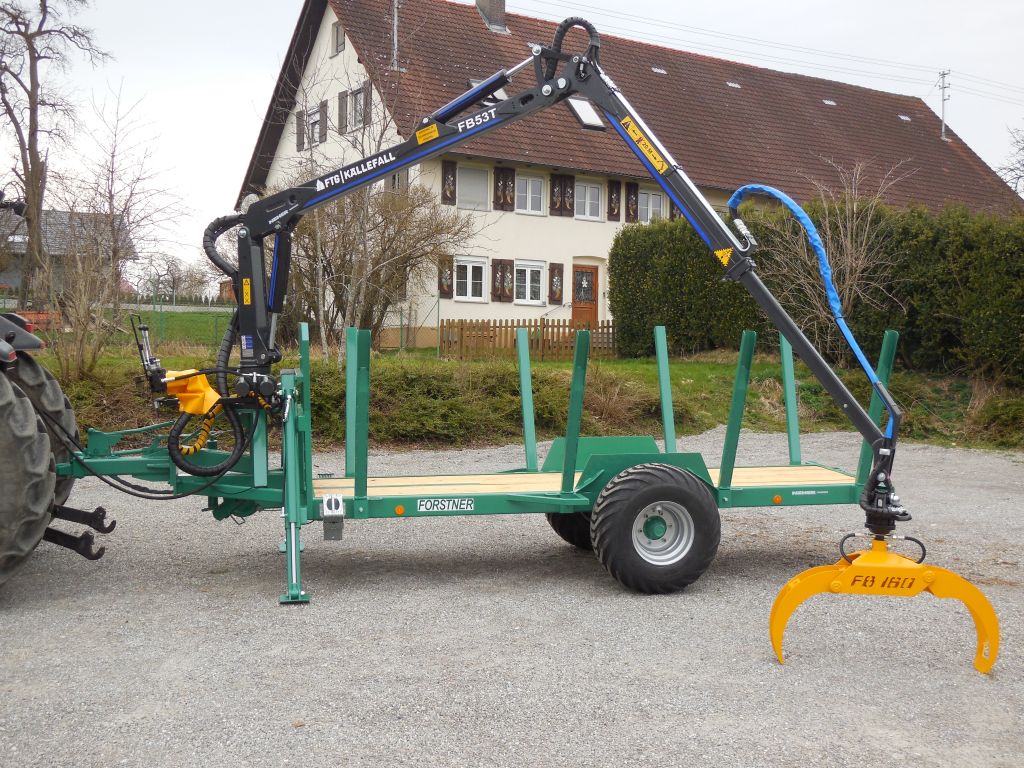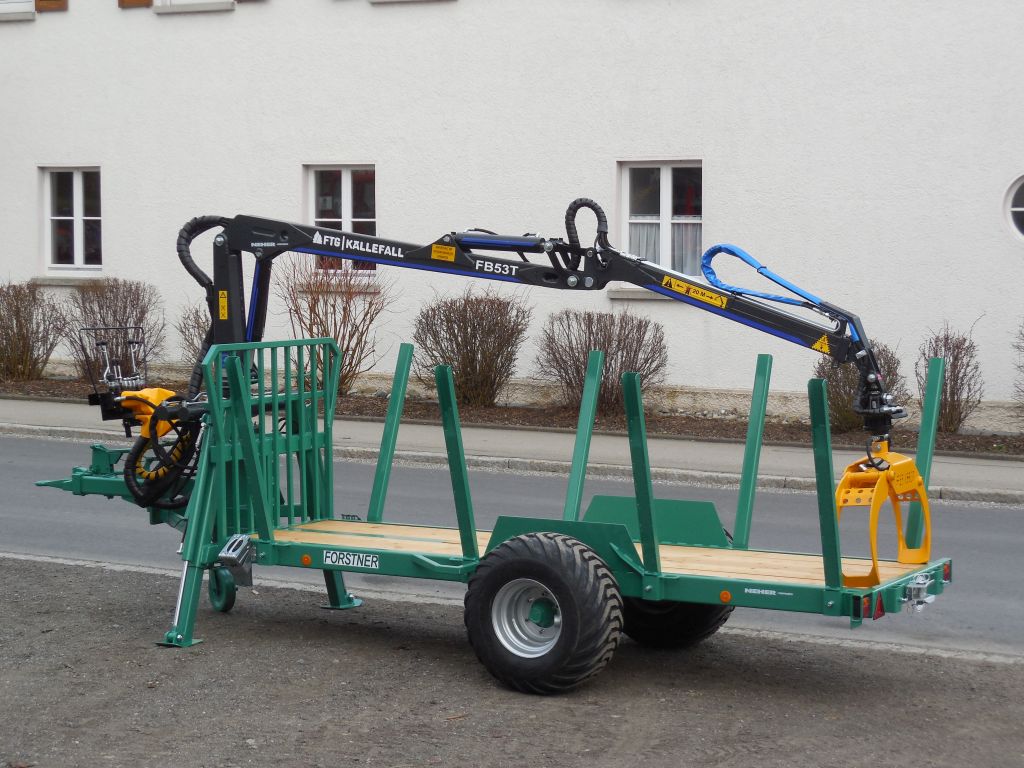 Die Brennholzanhänger Forstner F6 mit Forstkran ist ein als Tieflader konzipierter Forstanhänger, der sich für den universellen Einsatz im Forst eignet. Durch 8 umsteckbare Einsteckrungen mit 10 Rungenführungen (8 seitl. + 2 hinten) sowie dem durchgängigen Holzboden ist das Verladen und Transportieren von unregelmäßig langen/kurzen Holzstämmen, Meerholz, Energieholz und Restholzabschnitten möglich. Weiteres Merkmal dieser Forstanhänger ist die leichte und kompakte Bauweise, wodurch ein niedriger Schwerpunkt sowie eine gute Manövrierbarkeit gewährleistet wird. Mit Auflaufbremse / Rückmatic und Breitreifen ausgestattet, können beide Anhänger auch mit kleineren Traktoren ohne Druckluft bei voller Zuladung bis zu 6,9to betrieben werden.